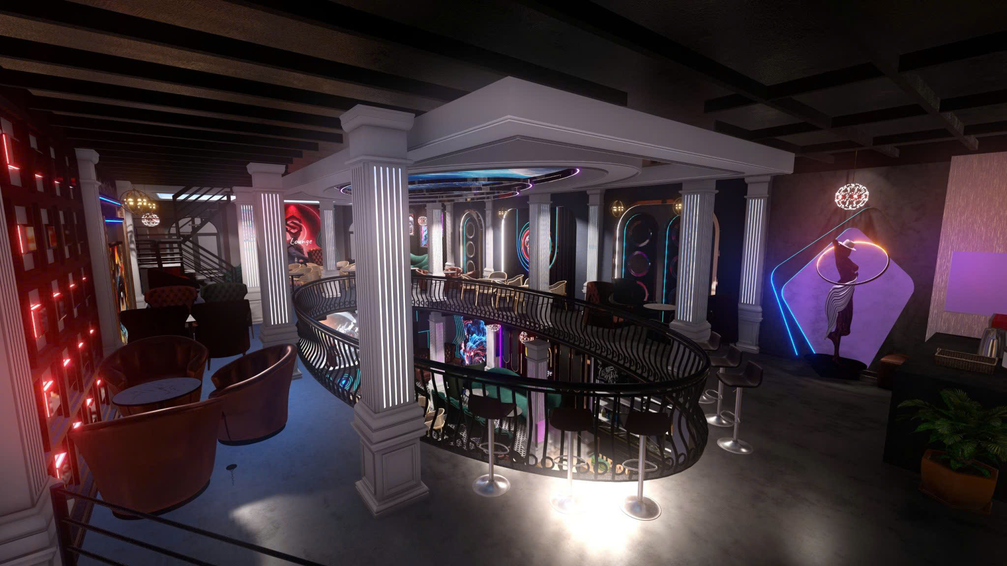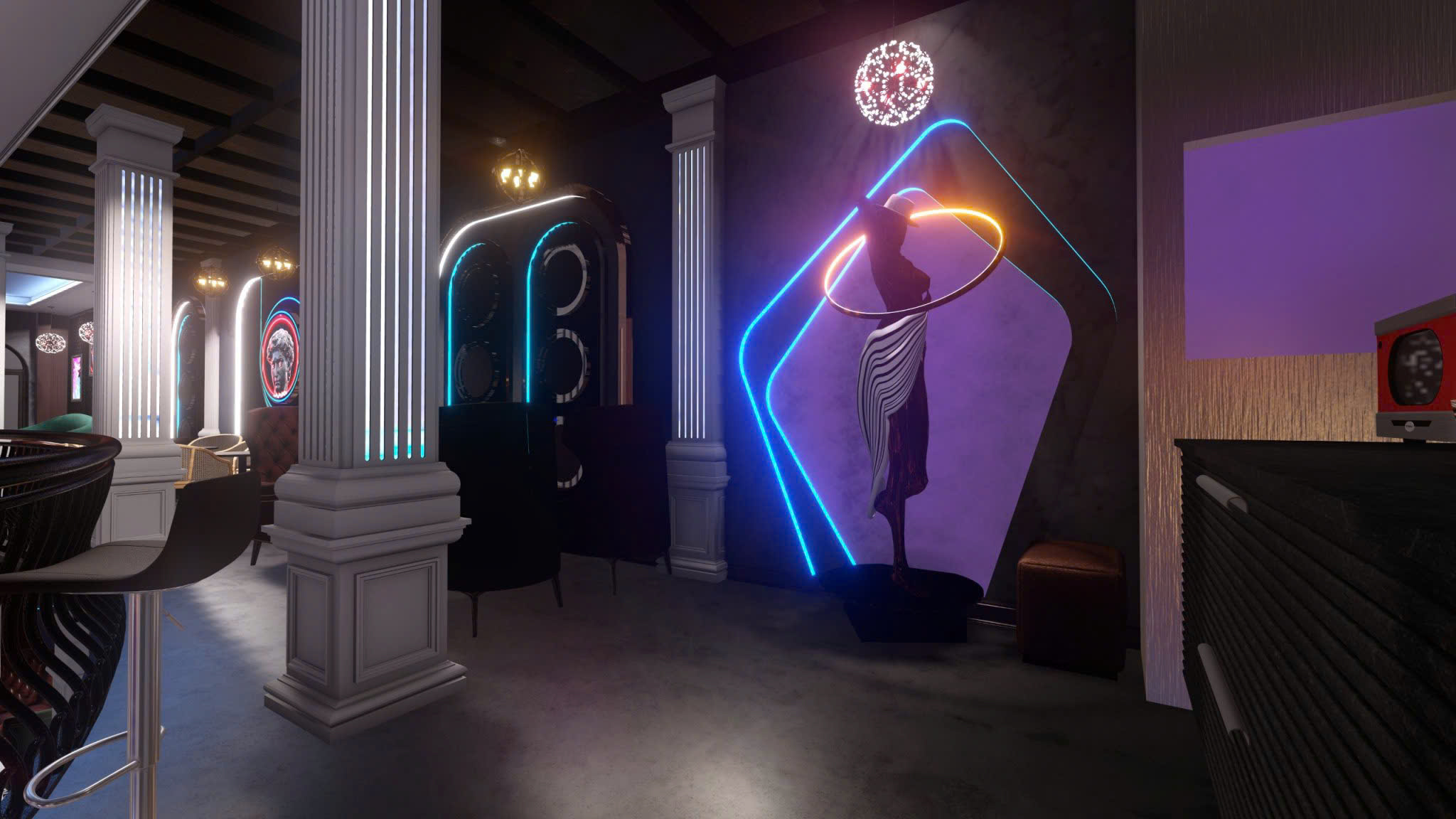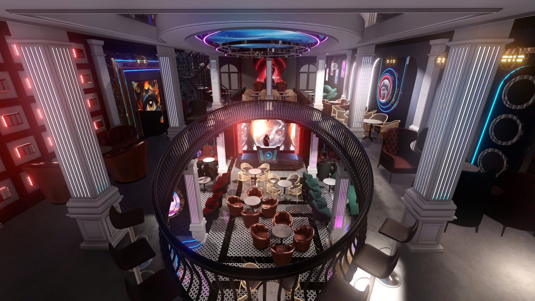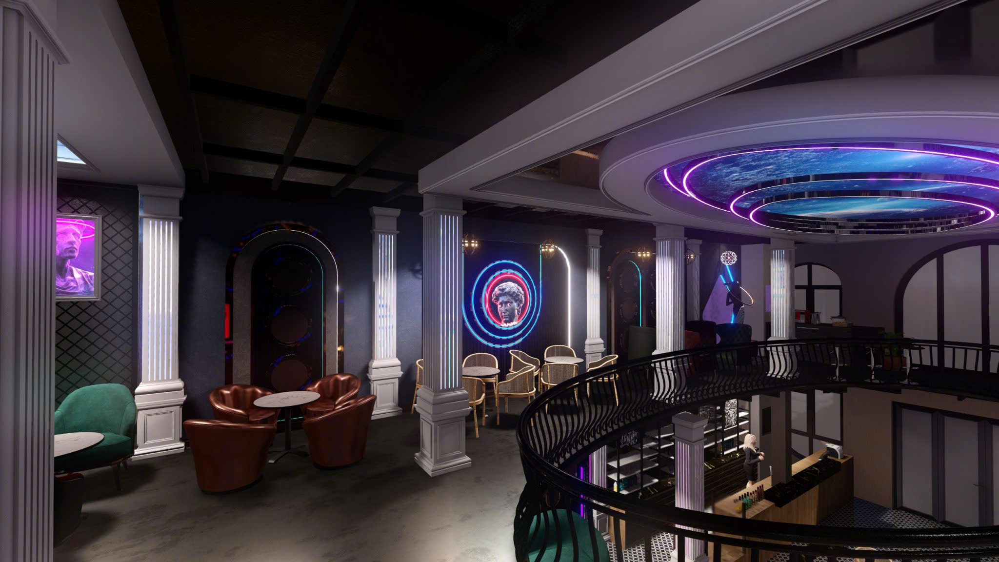 Công trình thiết kế theo phong cách Tân Cổ Điển pha neon nghệ thuật — cột trụ cẩm thạch, cầu thang xoắn, DJ stage ánh sáng laser, sảnh hai tầng hoành tráng.