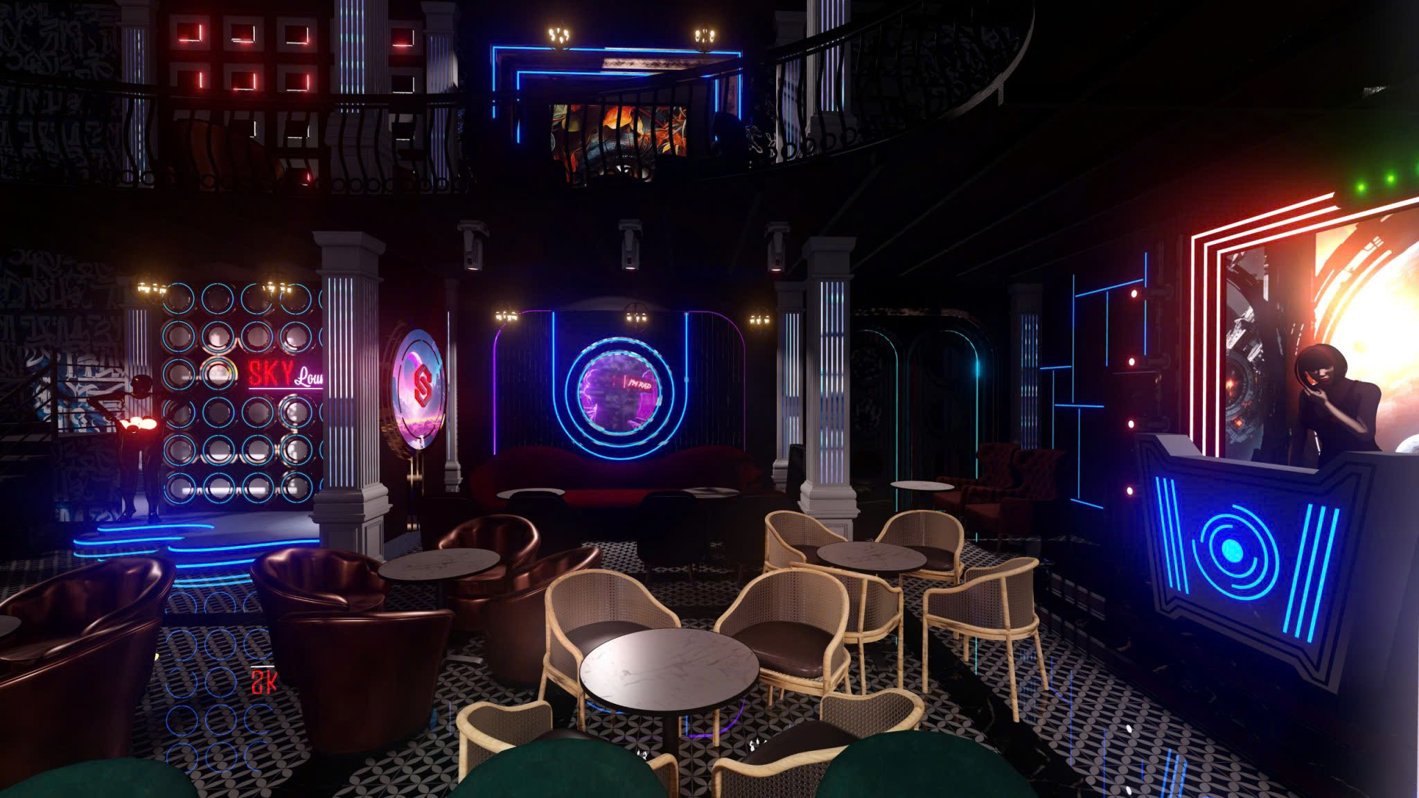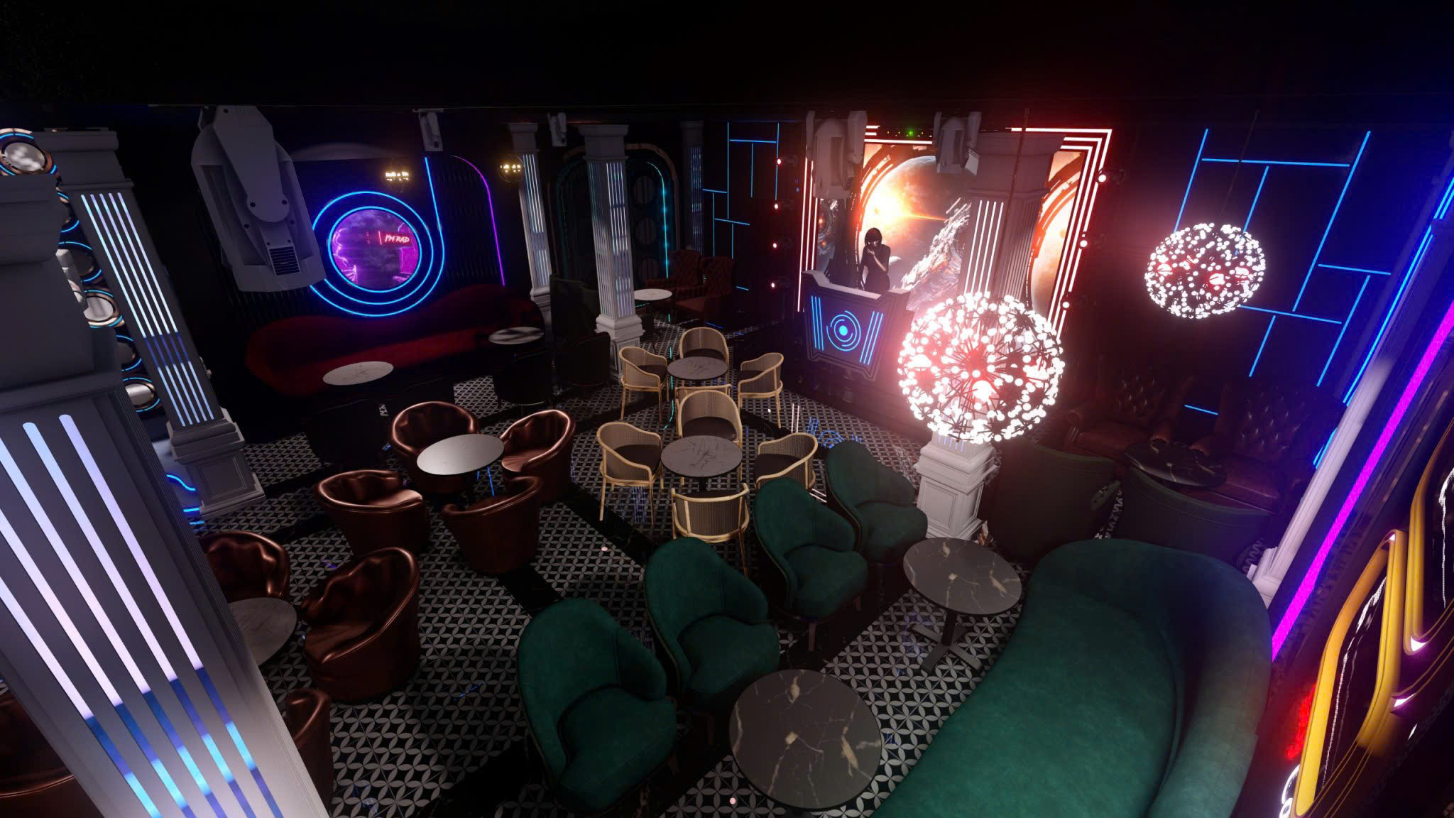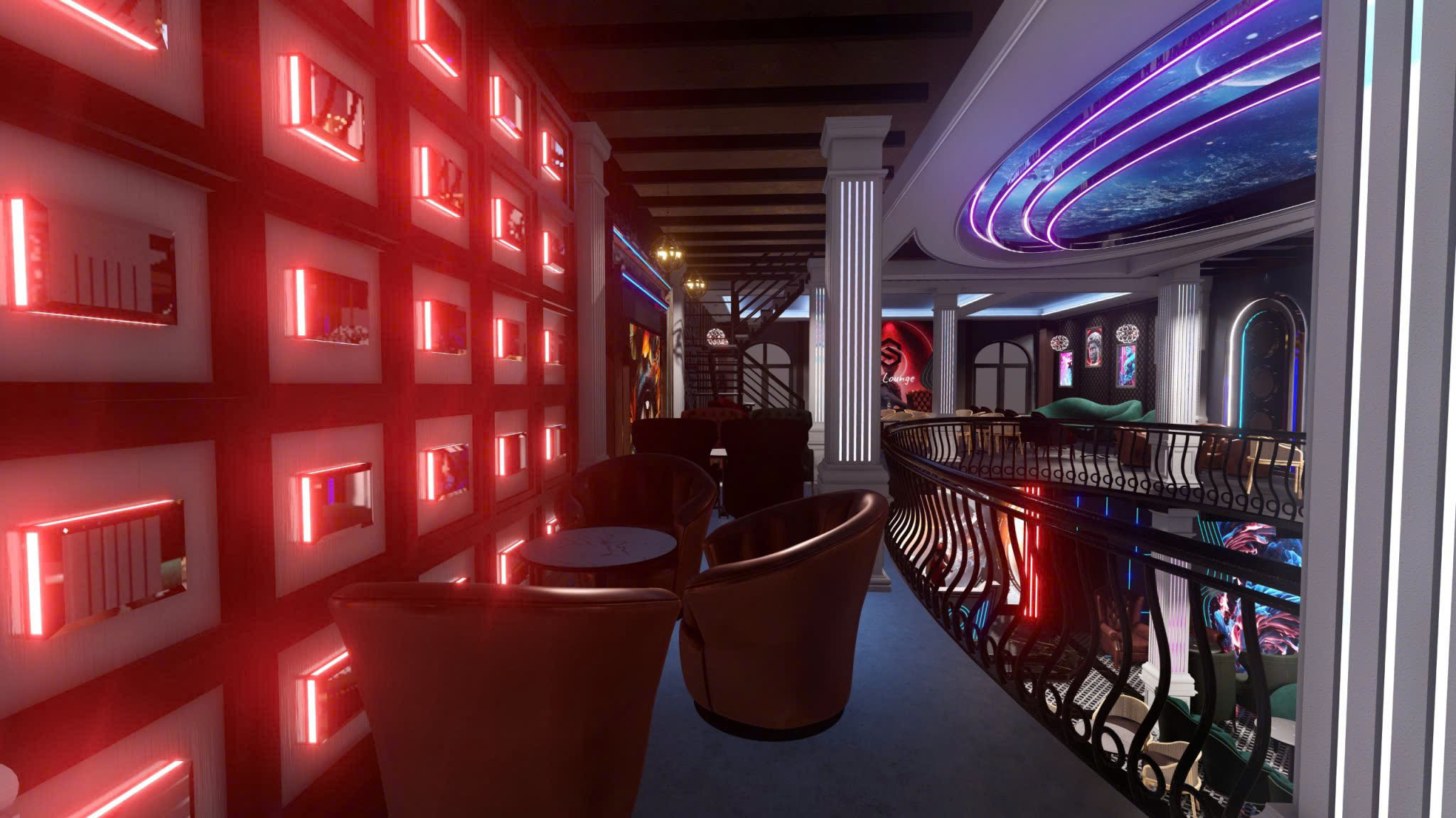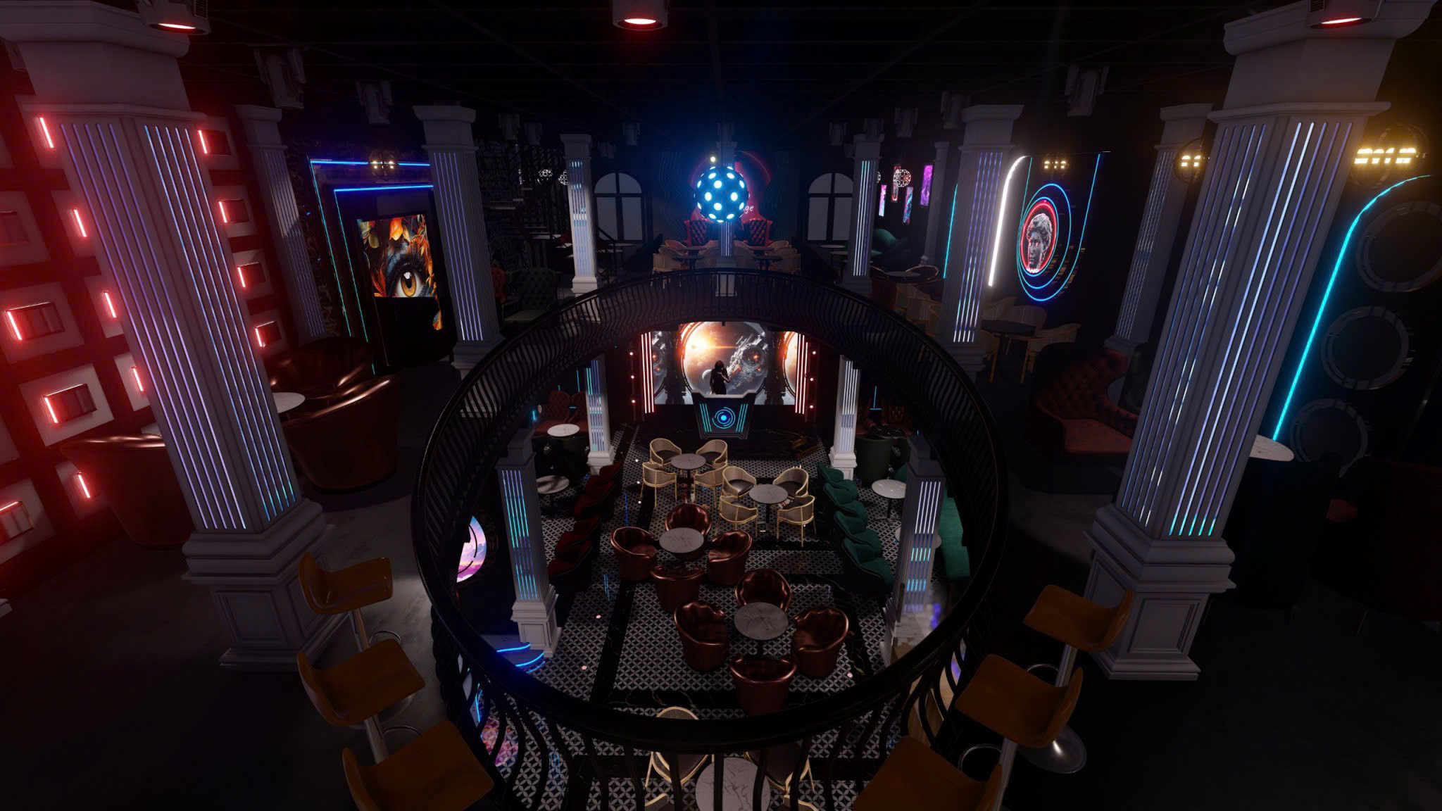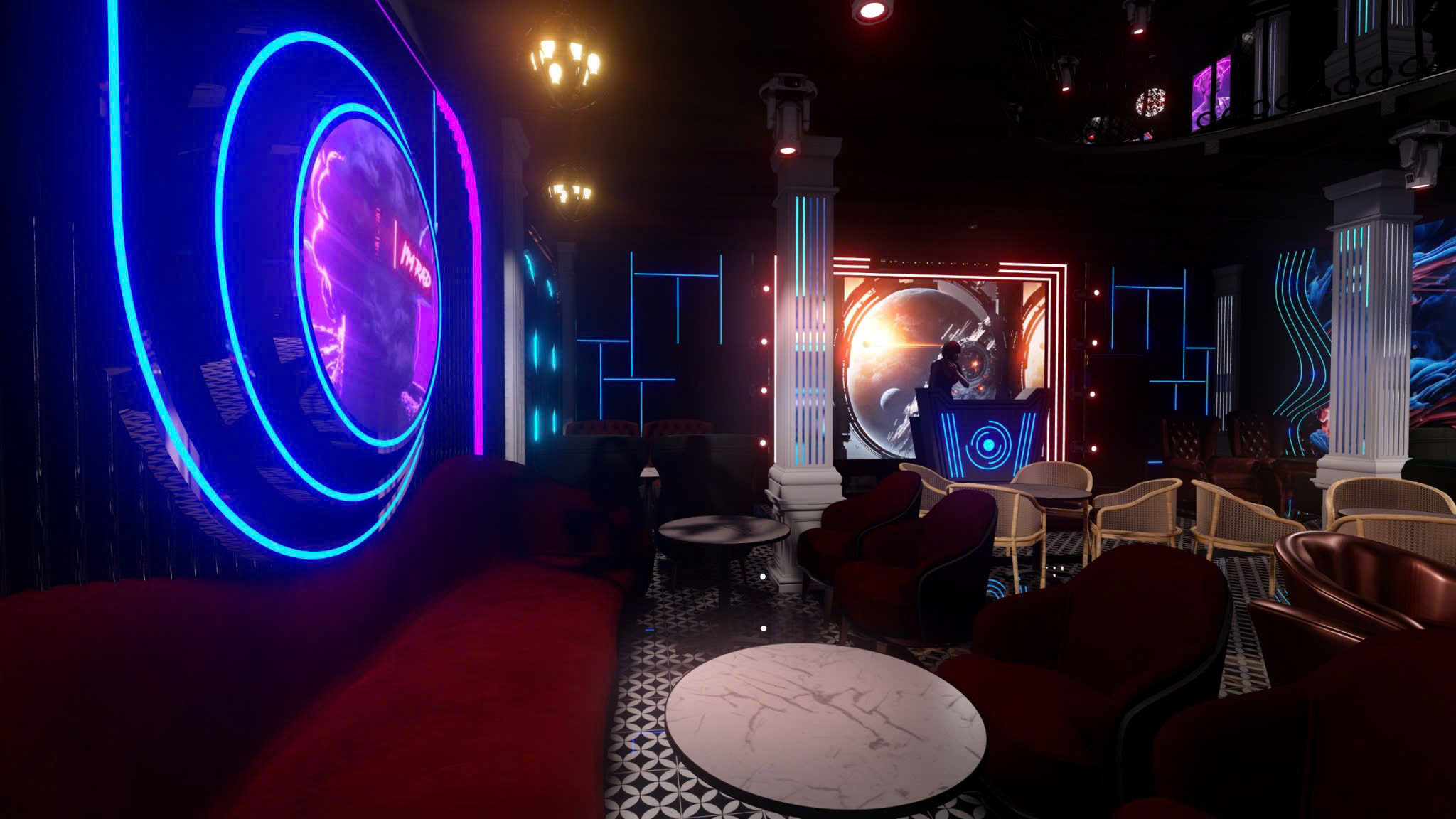 Công trình thiết kế theo phong cách Tân Cổ Điển pha neon nghệ thuật — cột trụ cẩm thạch, cầu thang xoắn, DJ stage ánh sáng laser, sảnh hai tầng hoành tráng.
