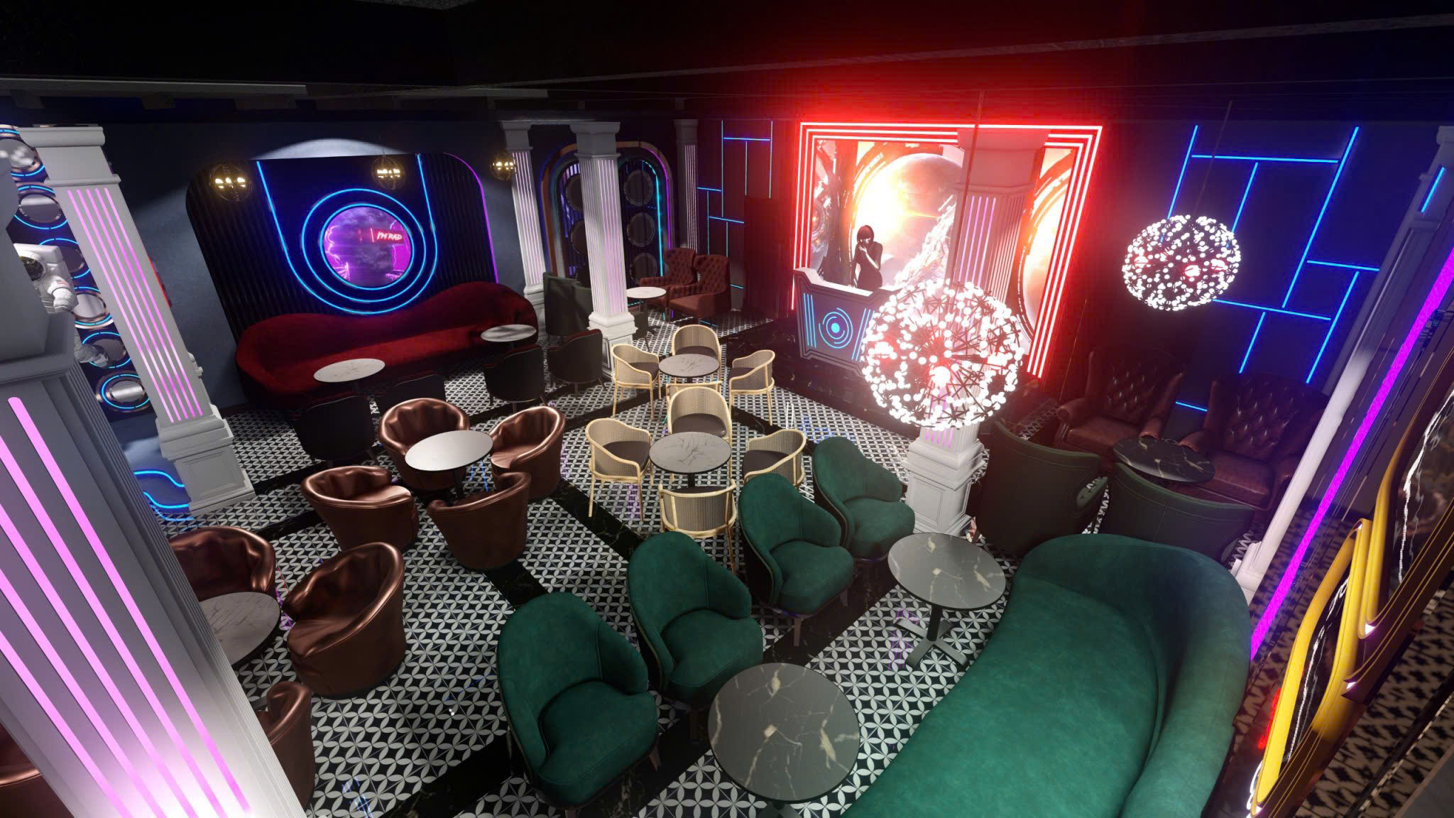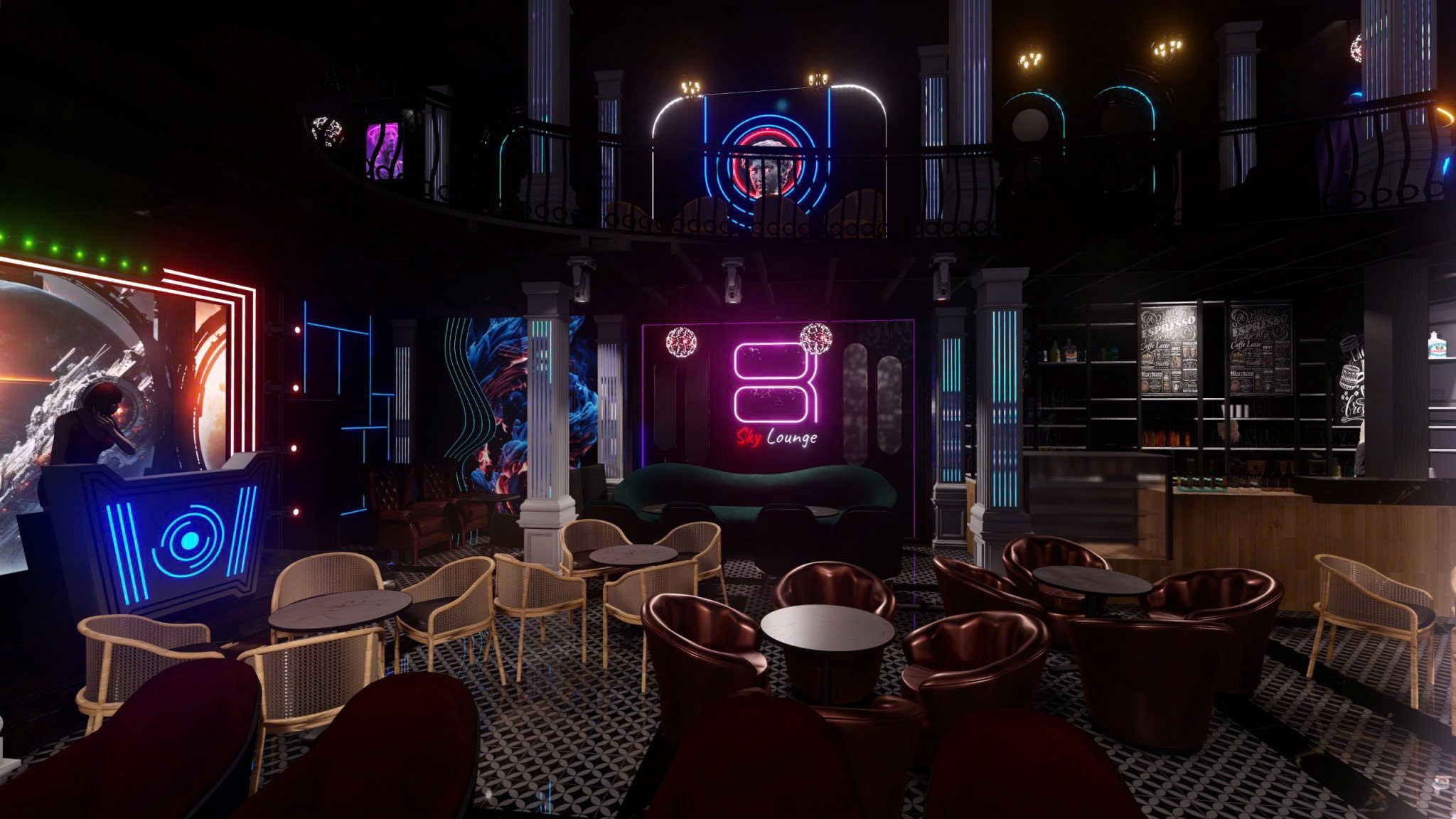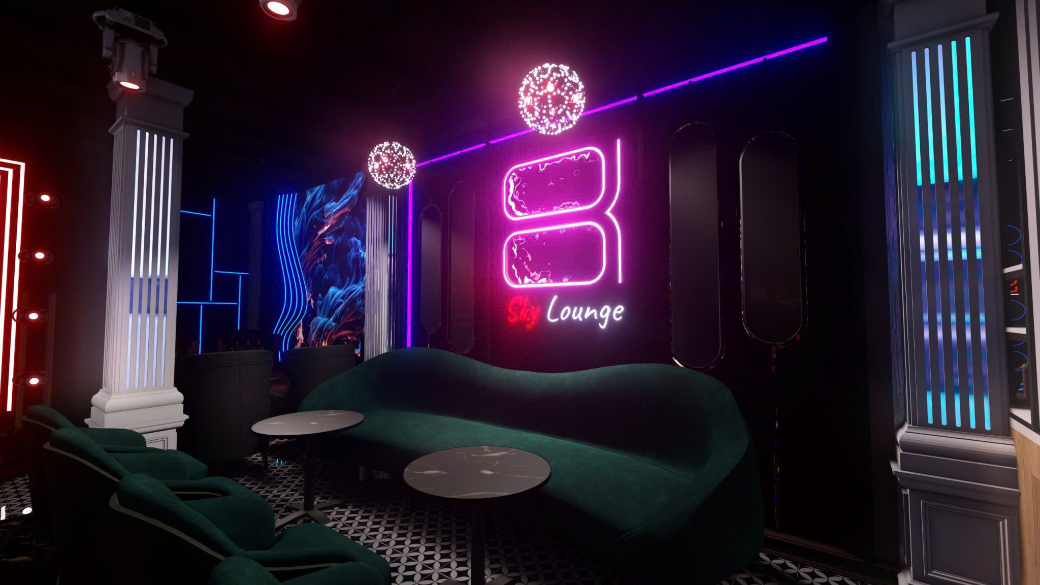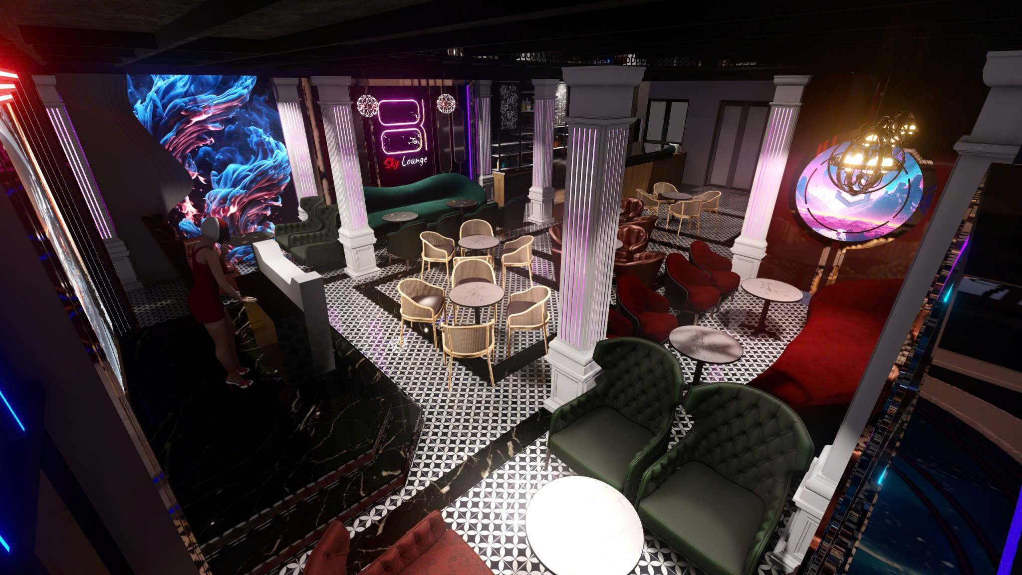 Công trình thiết kế theo phong cách Tân Cổ Điển pha neon nghệ thuật — cột trụ cẩm thạch, cầu thang xoắn, DJ stage ánh sáng laser, sảnh hai tầng hoành tráng.