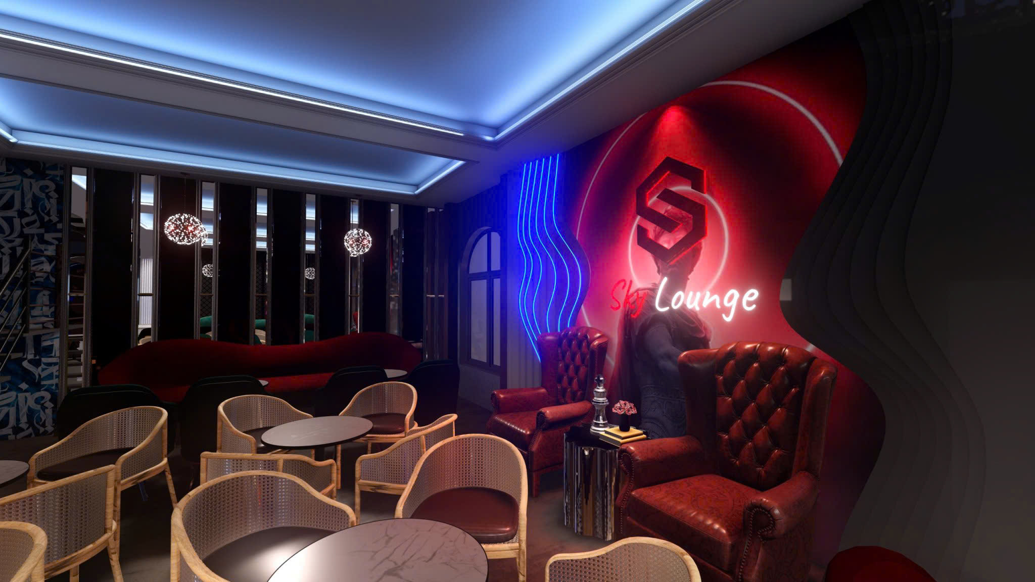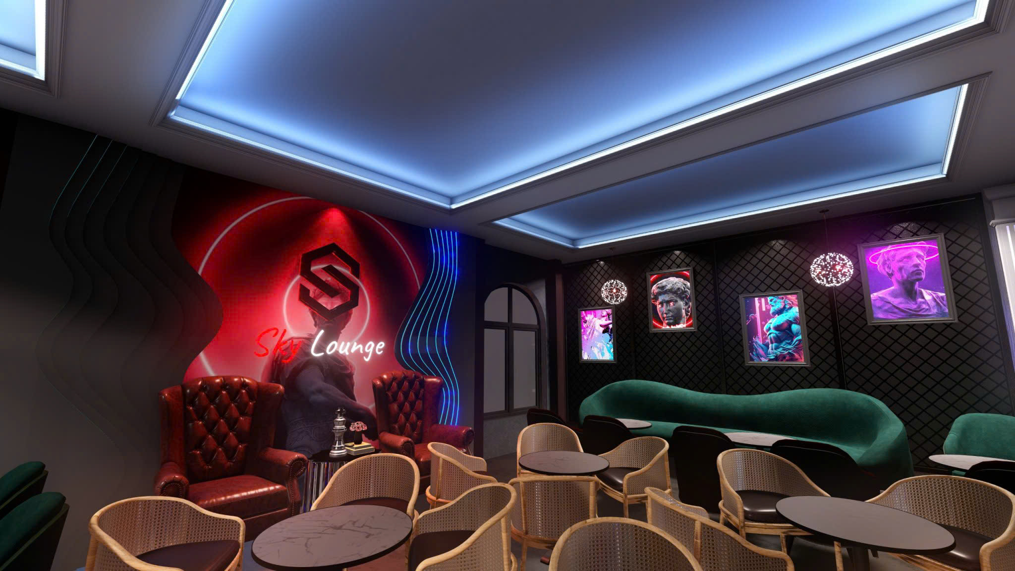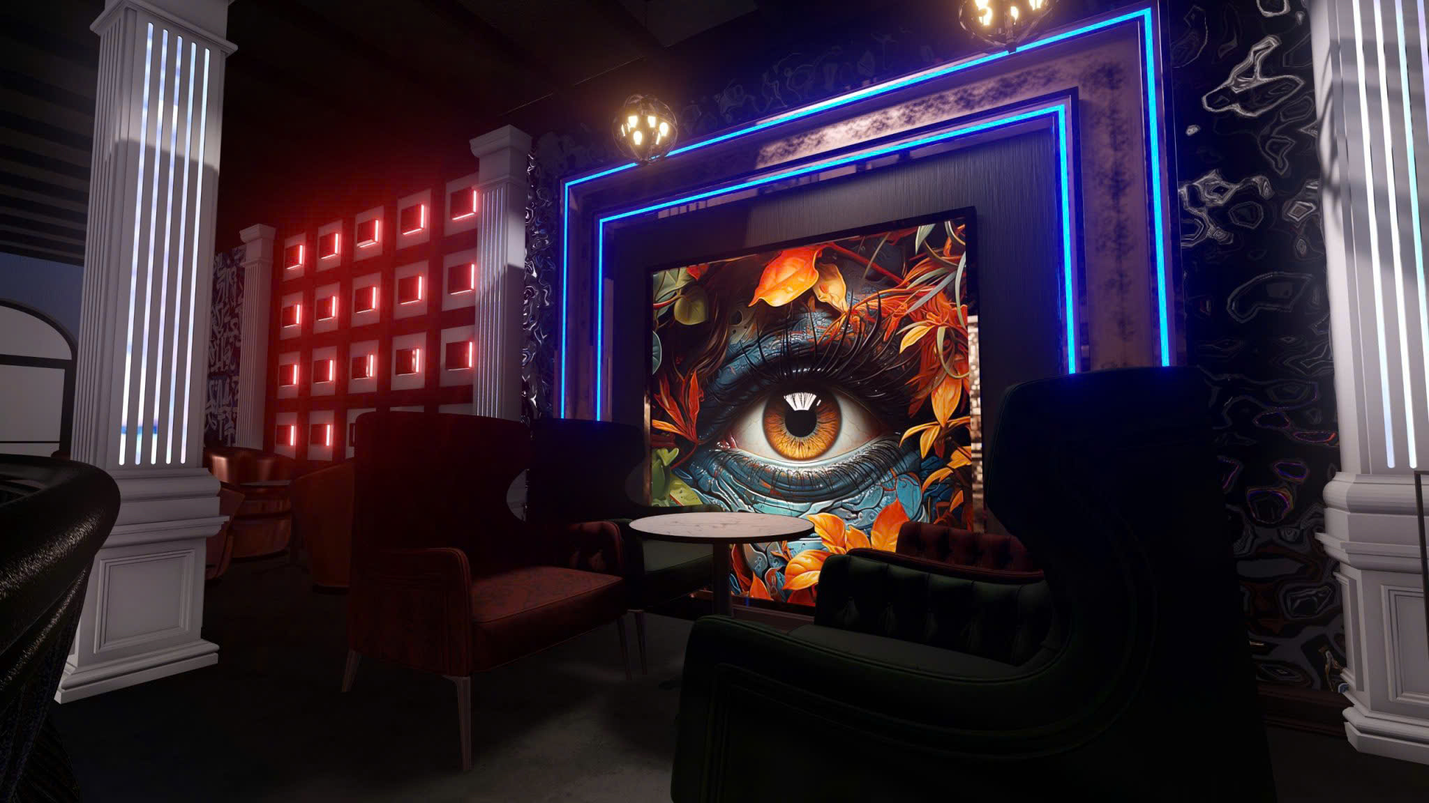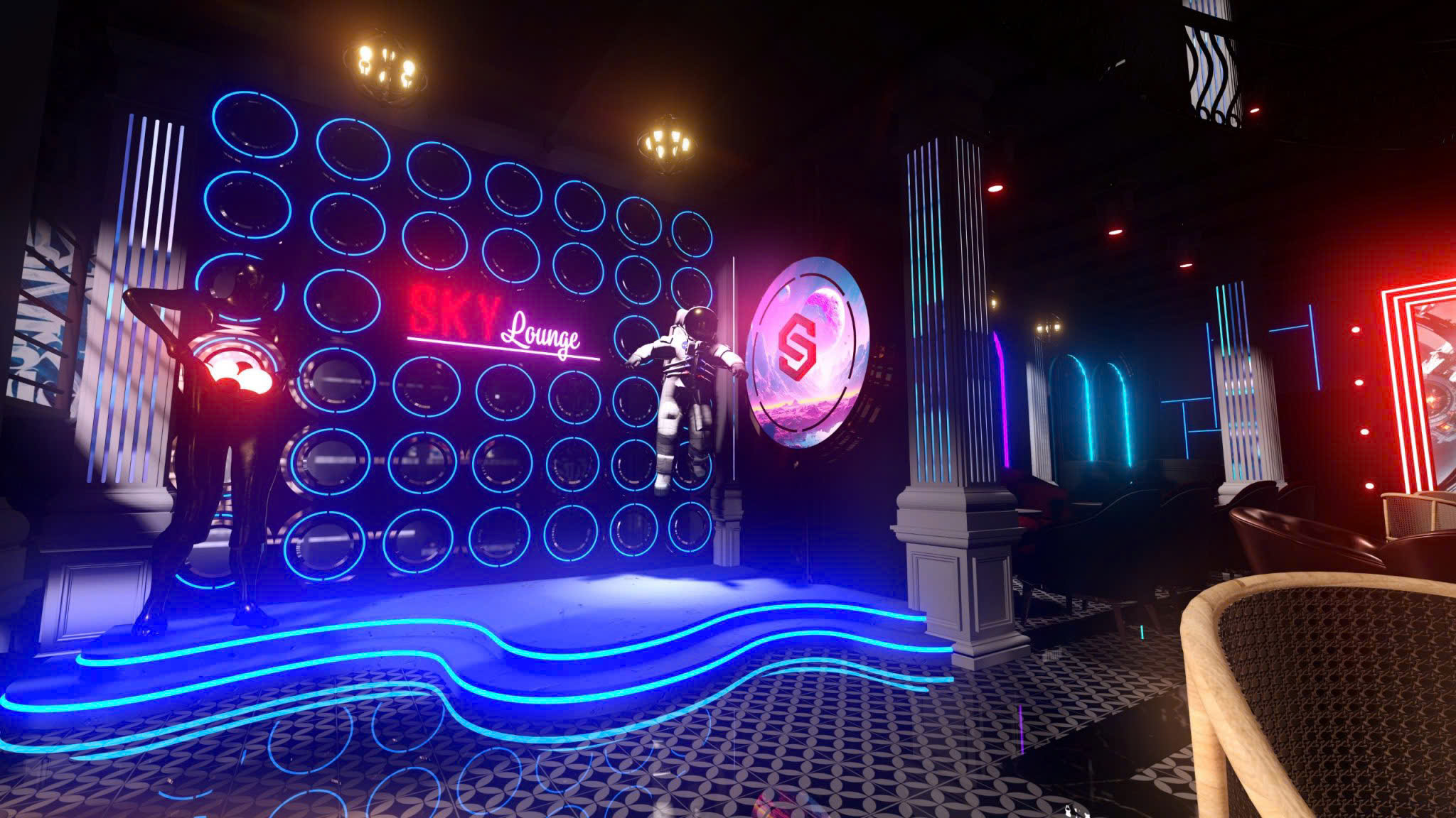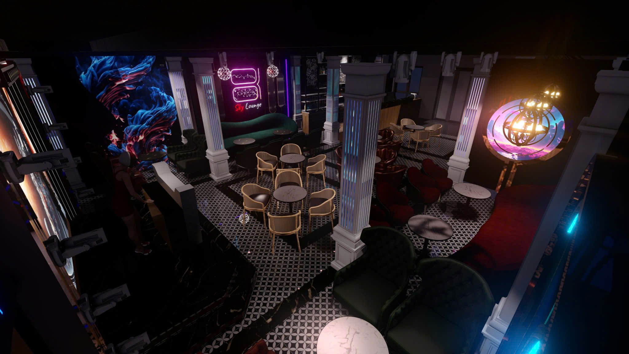 Công trình thiết kế theo phong cách Tân Cổ Điển pha neon nghệ thuật — cột trụ cẩm thạch, cầu thang xoắn, DJ stage ánh sáng laser, sảnh hai tầng hoành tráng.
