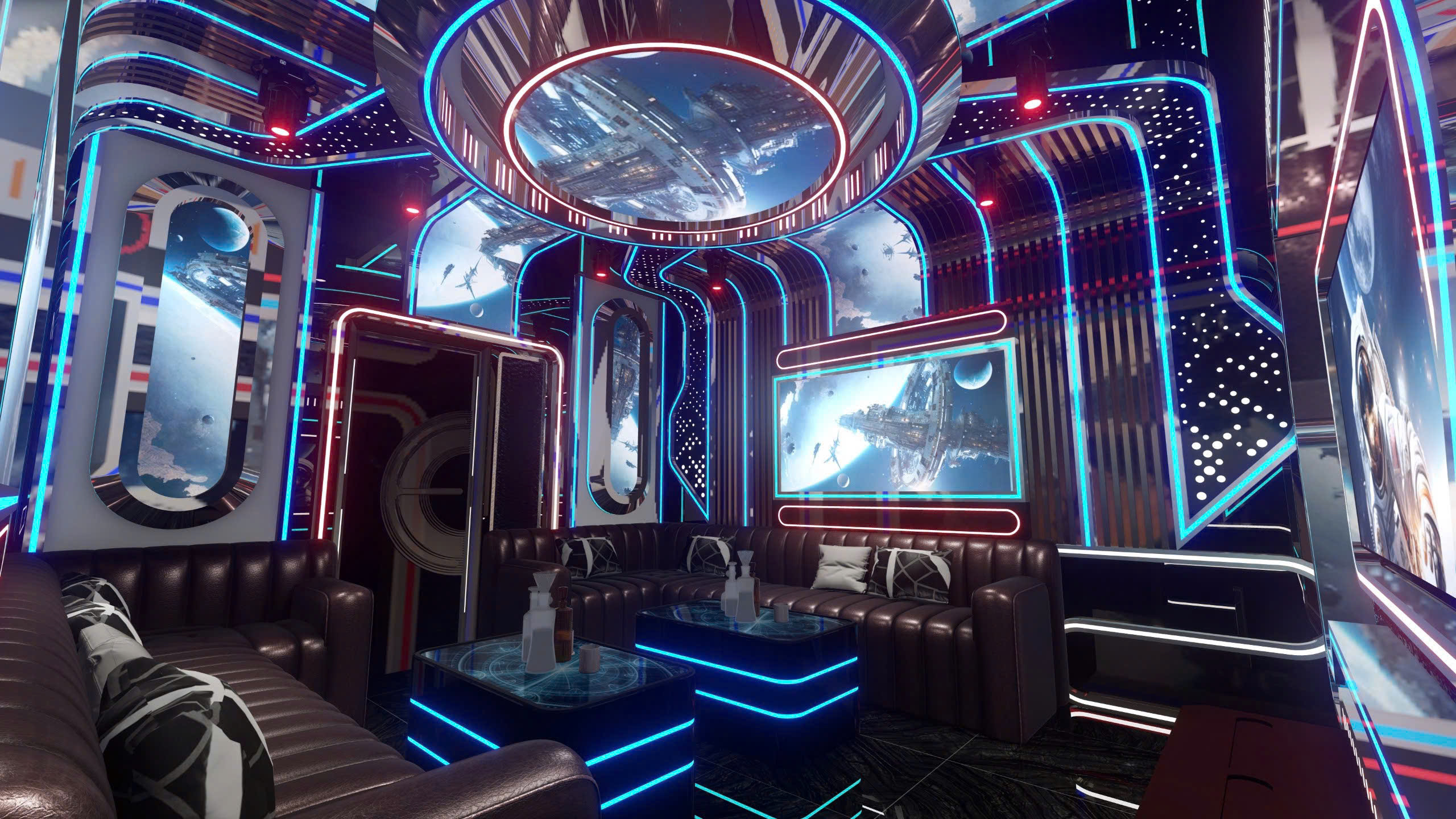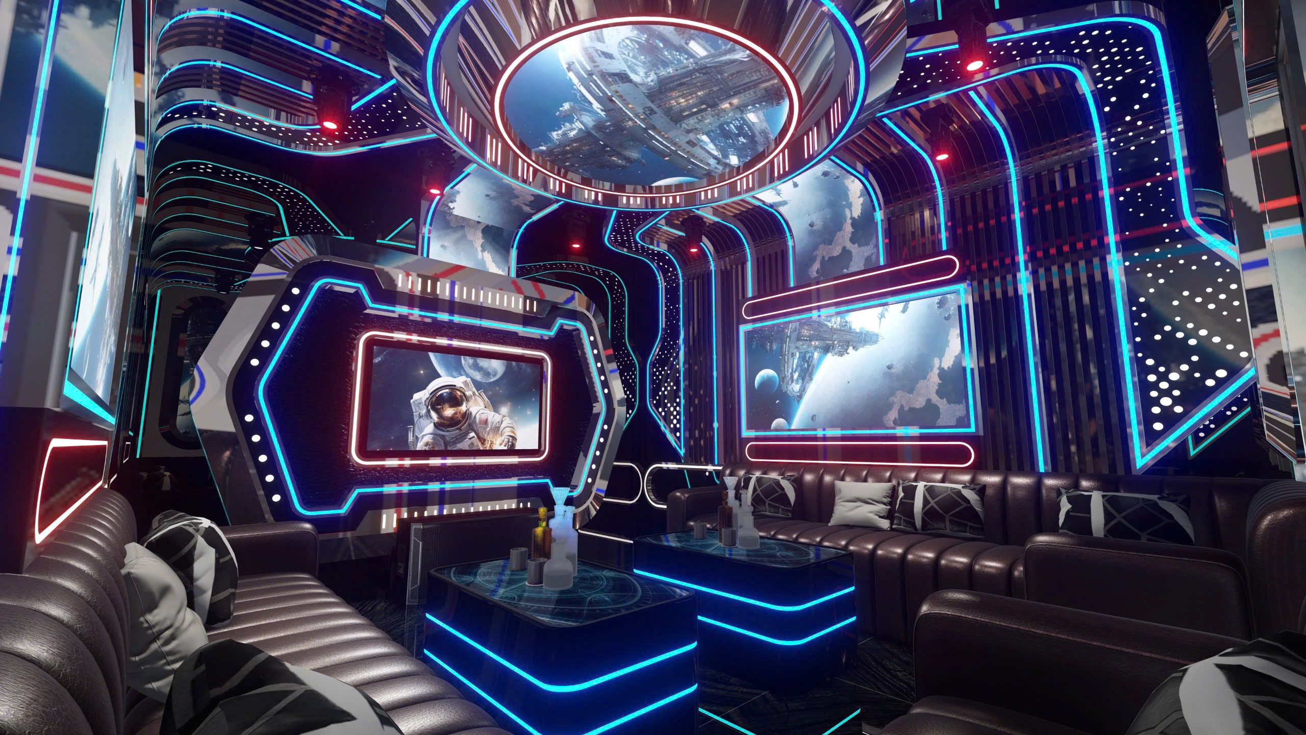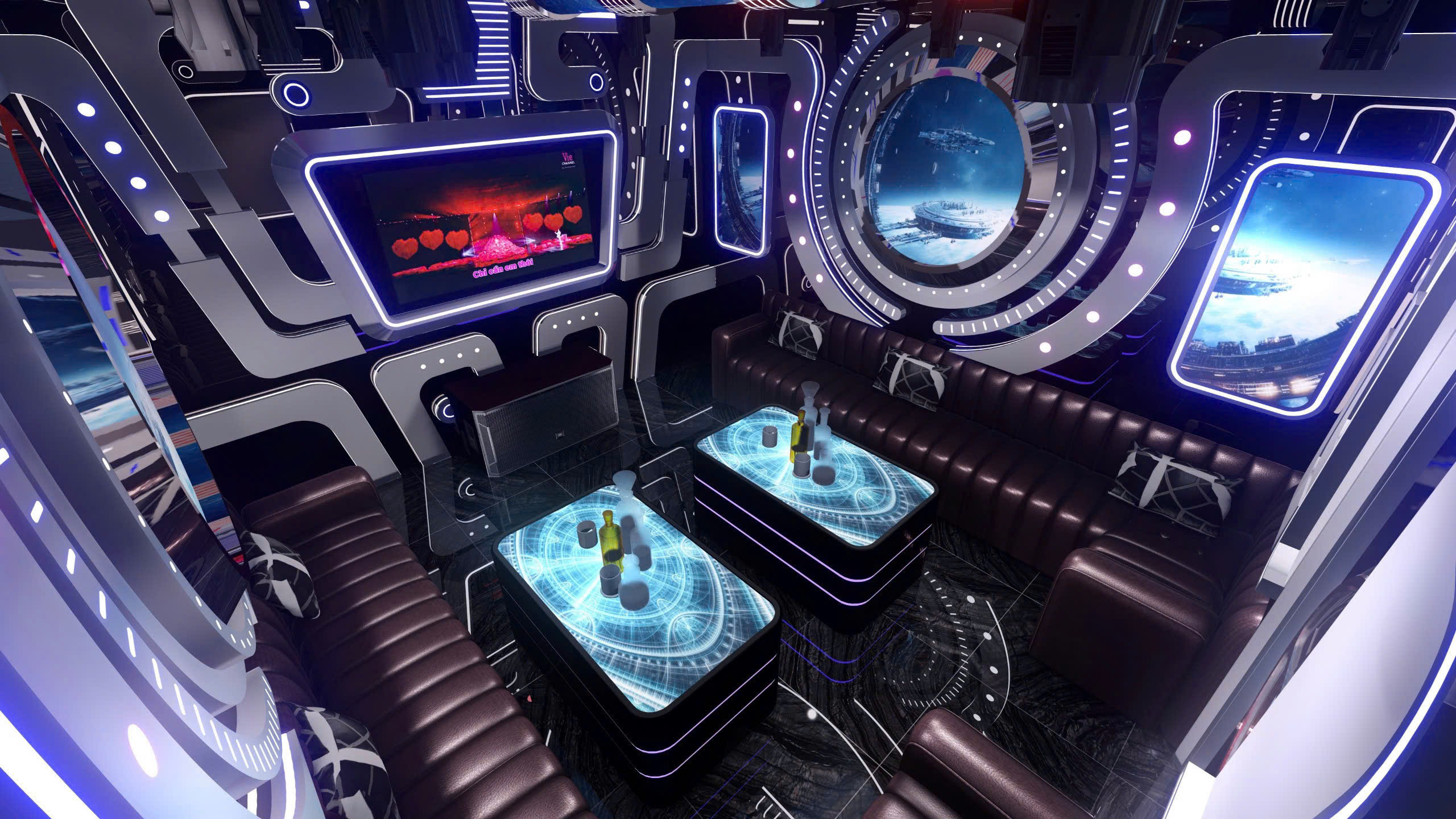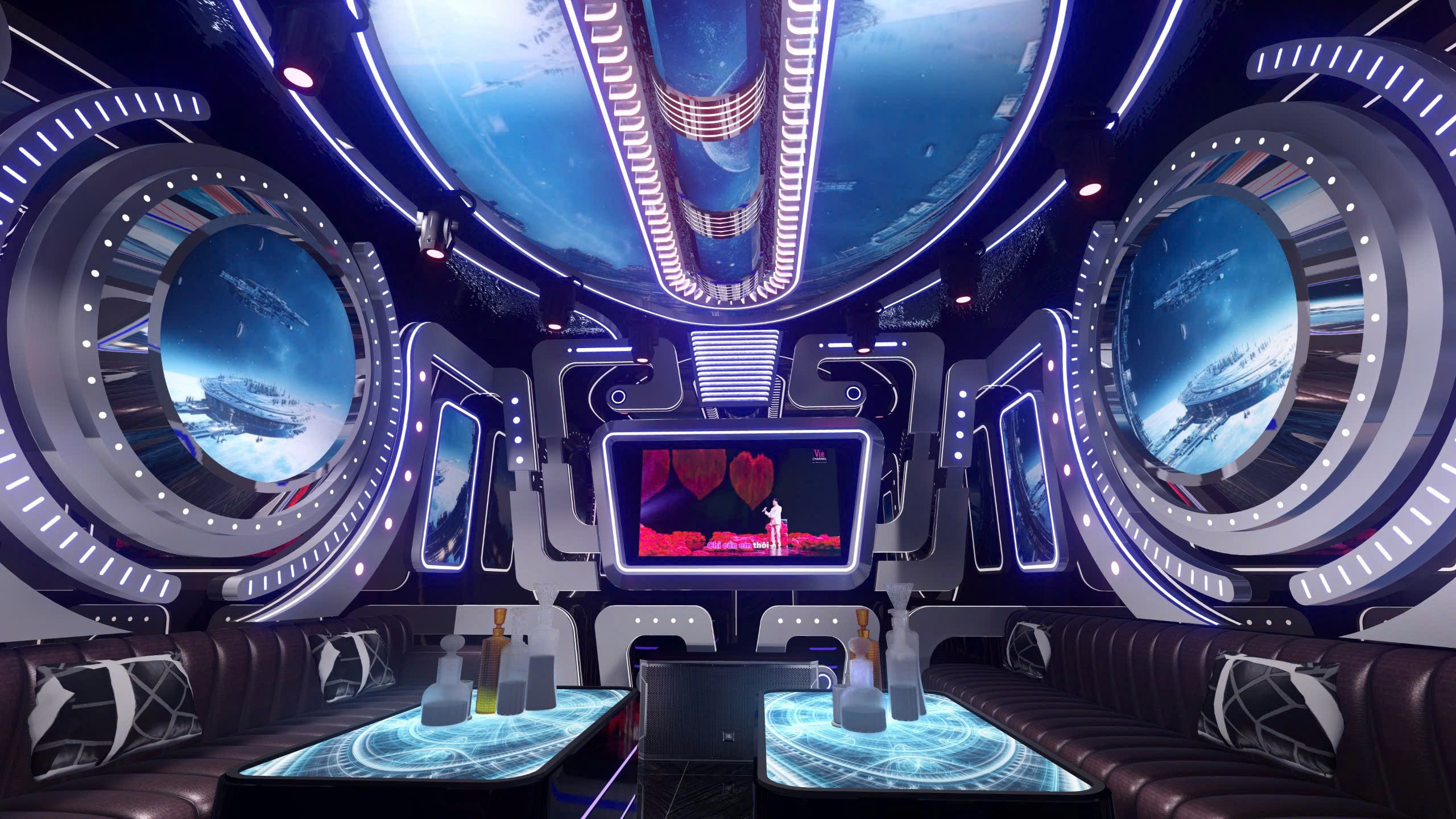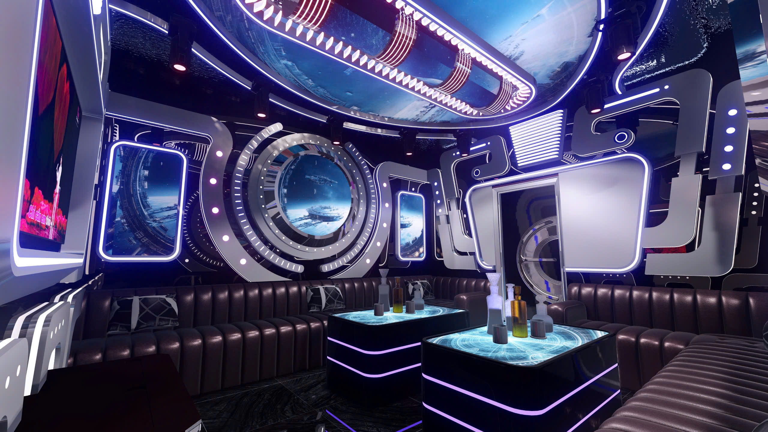 Phòng karaoke theo chủ đề vũ trụ — công nghệ LED panel toàn bộ tường/trần, màn hình 4K nhúng trong khung phi thuyền, nội thất da cao cấp, bàn LED phát sáng.