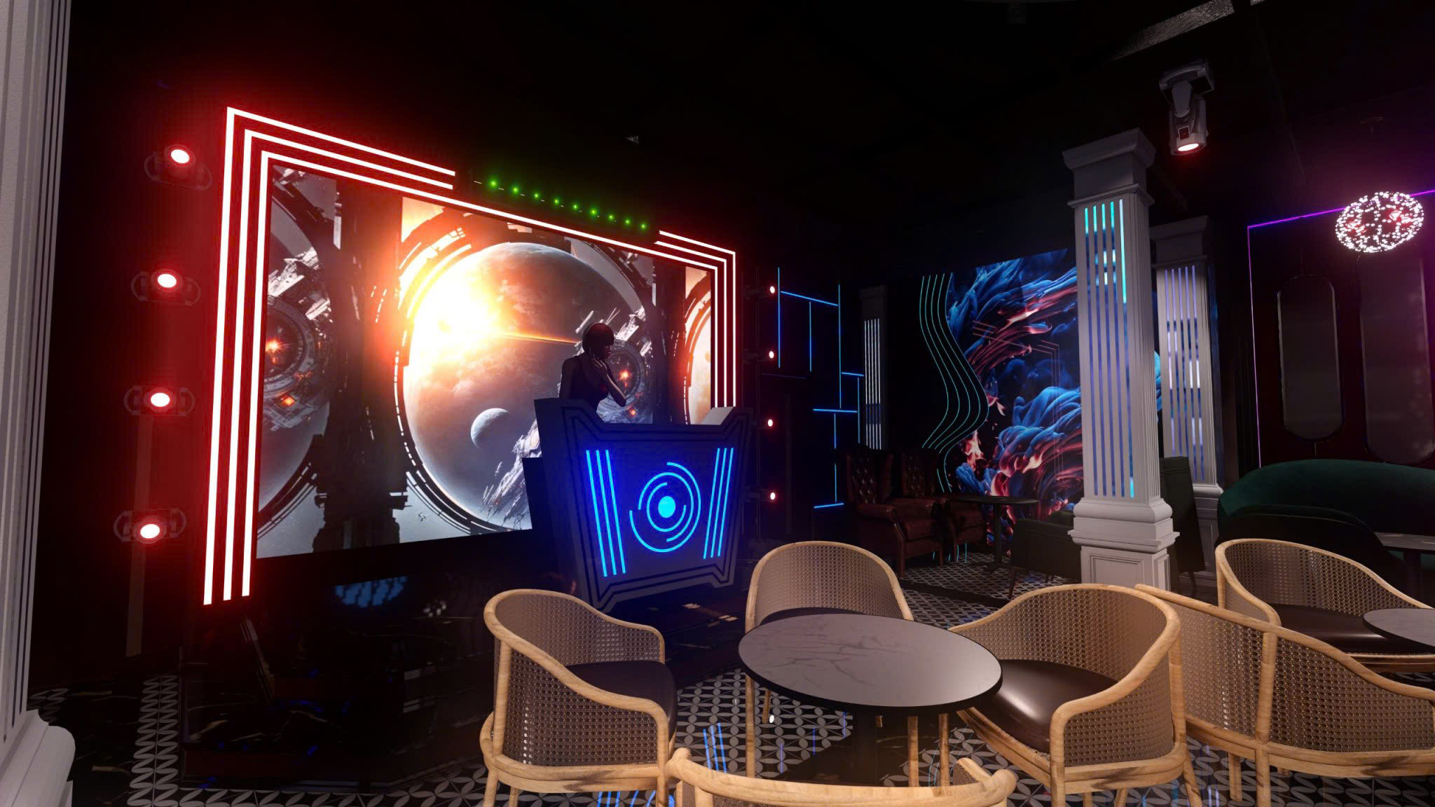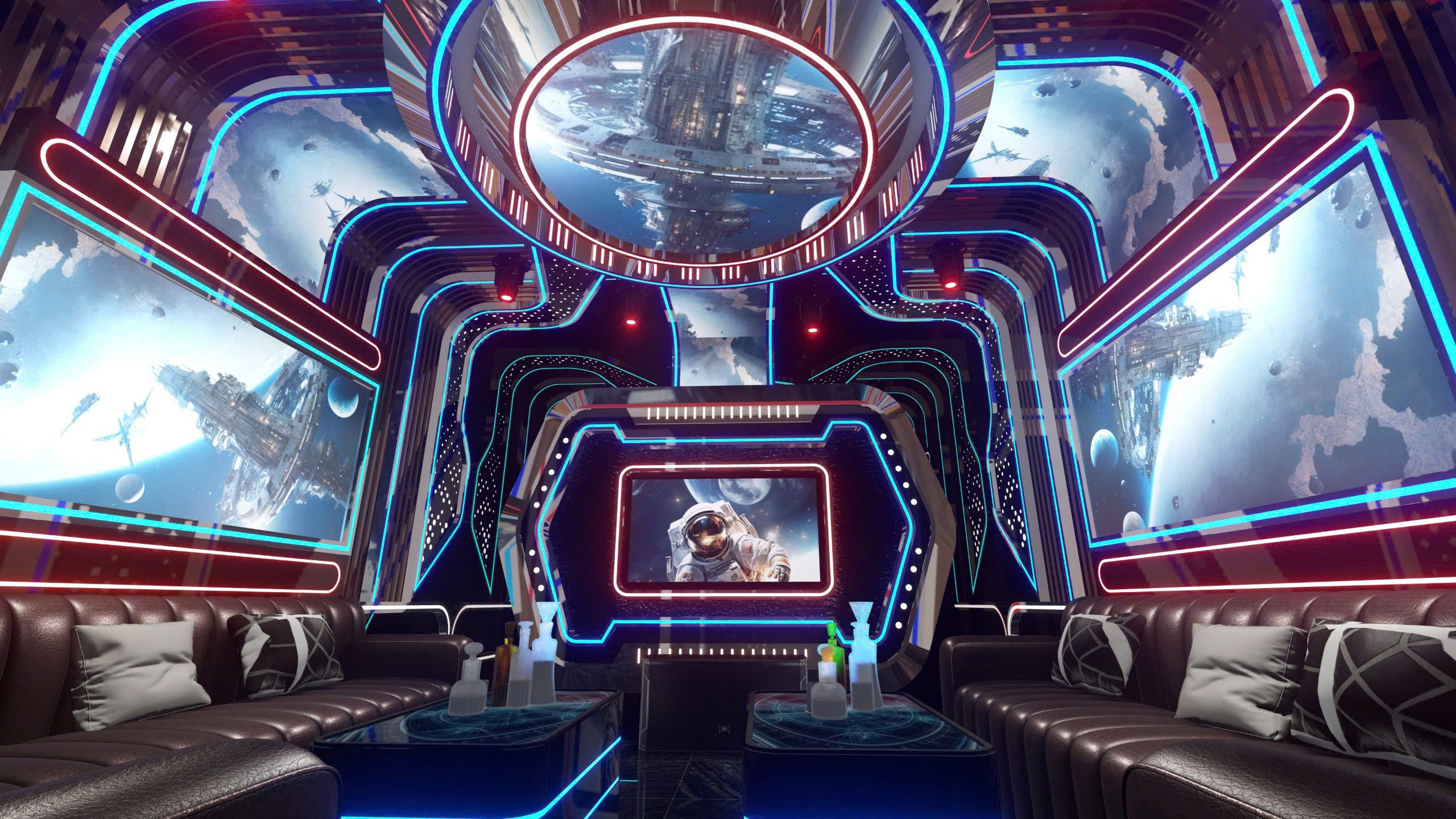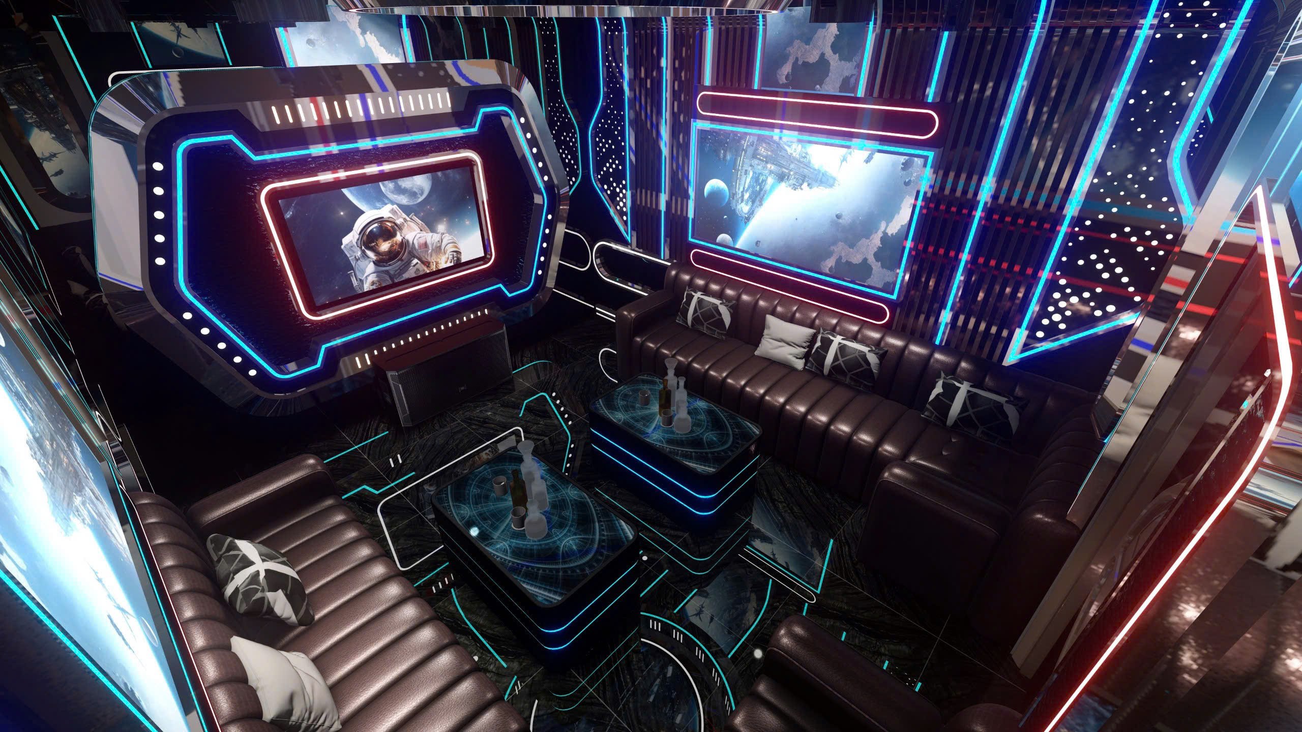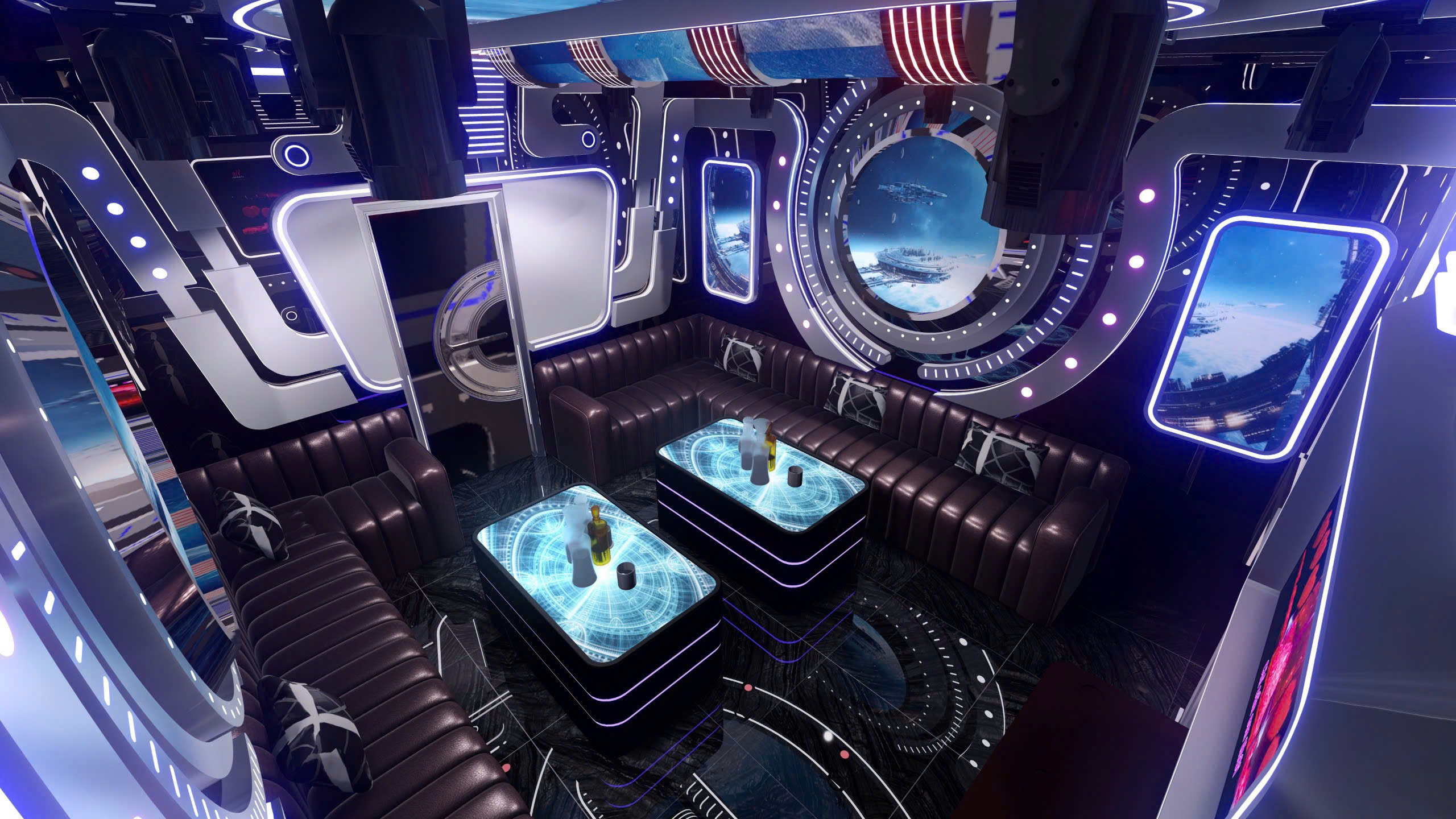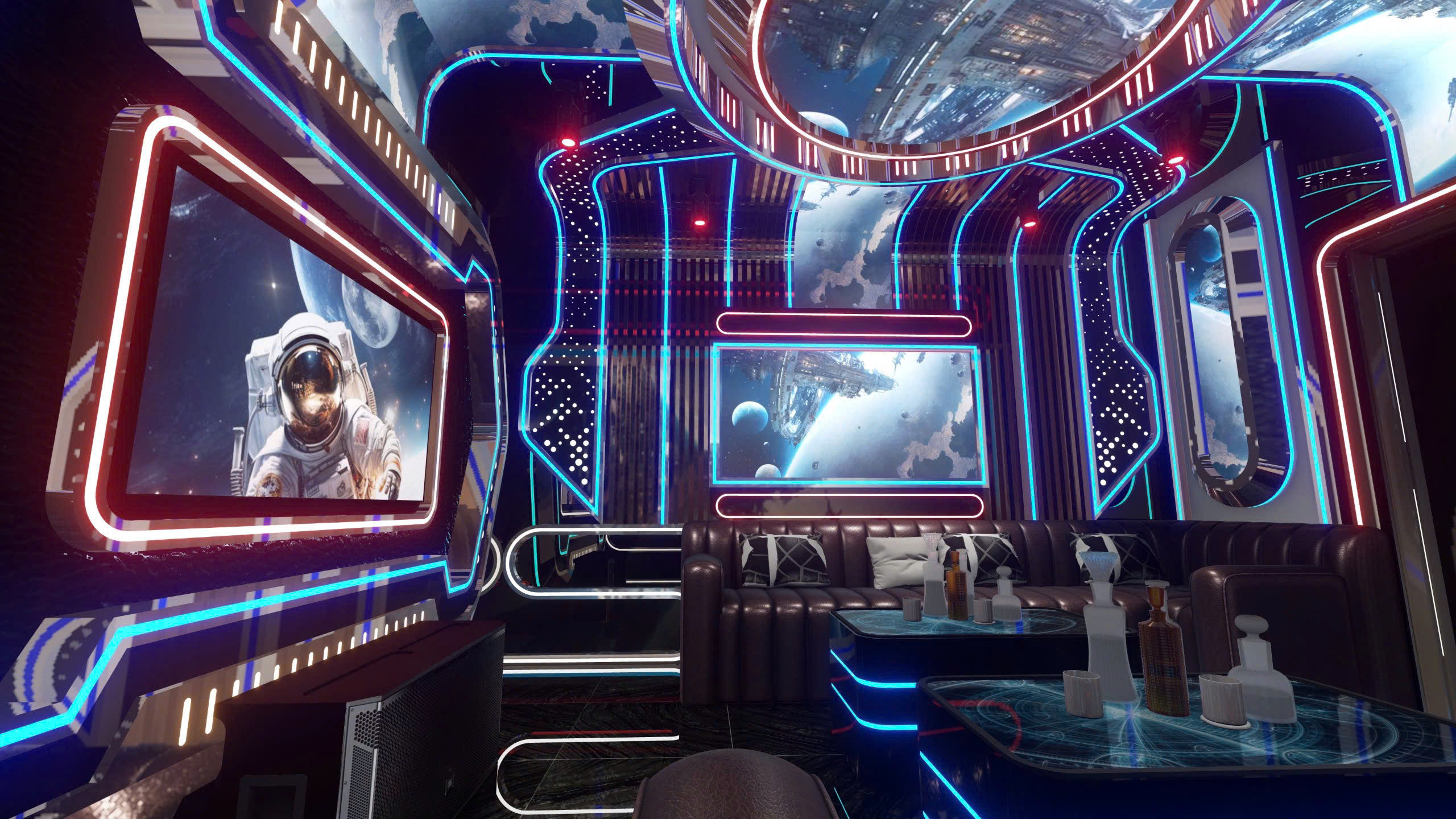 Phòng karaoke theo chủ đề vũ trụ — công nghệ LED panel toàn bộ tường/trần, màn hình 4K nhúng trong khung phi thuyền, nội thất da cao cấp, bàn LED phát sáng.
